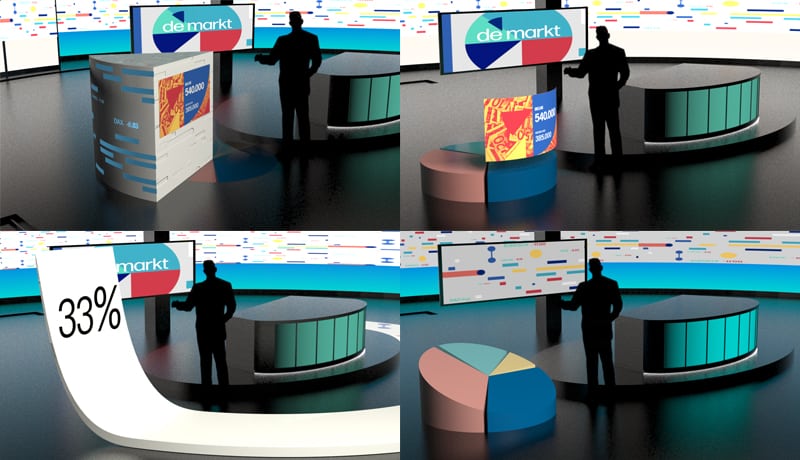 In De Markt project, I created 3D model of VRT Nieuws studio to design visual elements for Vizrt live broadcasting.